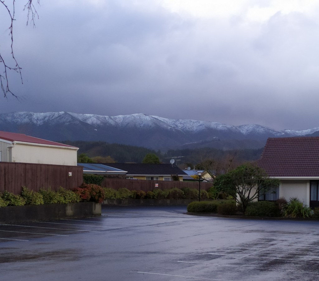 Daar was ‘n heerlike paar sonnige dae gewees. Toe begin die weervoorspelling verander na ‘n koue suidpool front wat aan die kom is. Daar word baie sterk wind voorspel; sneeu tot op 200 meter. Hier waar ek bly in Upper Hutt gaan die een hoofweg oor ‘n hoë bergpas. Die voorspelling sê: Sneeu op Rimutakas(bergreeks naby my). Motoriste moet versigtig ry want dis nie net die wind wat tot 140 km per uur waai nie maar die sneeu gaan pad glad maak. Motoriste moet maar eers nagaan of die pad oop is.