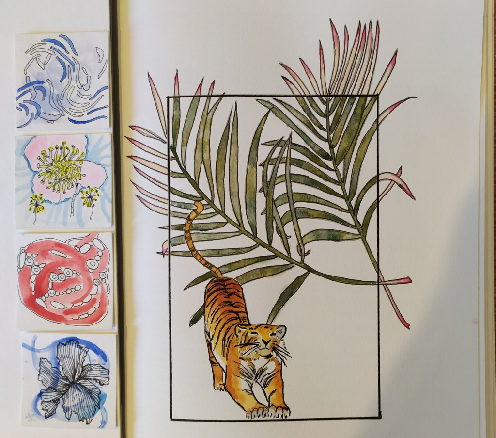 Elke dag gee die persoon ‘n woord wat mens moet uitbeeld op ‘n klein vierkantige stukkie papier. Sy het voorgestel om 2×2 duim waterverf papier te gebruik omdat mens enige medium kan gebruik om patrone te maak. Sy gee nie voorbeelde nie. Als kom uit jouself uit.